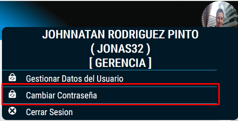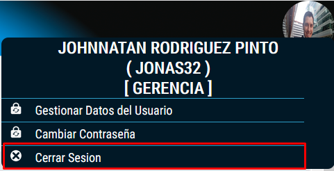 En la parte superior derecha de la pantalla se encuentra la imagen asociada al perfil. Al dar clic sobre esa imagen, se despliegan las opciones para gestionar datos del usuario, cambiar la contraseña y para cerrar la sesión con el fin de salir adecuadamente del sistema.