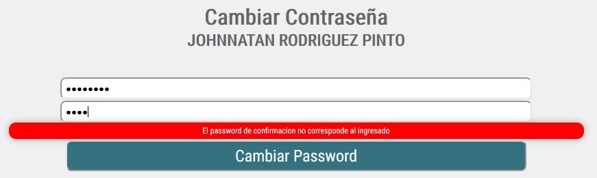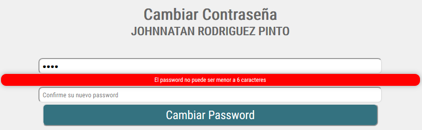 Si se deja de cumplir alguna de estas condiciones es decir que la contraseña tenga menos de 6 caracteres y/o que la casilla de confirmación no sea exactamente la combinación de caracteres de la primera casilla, el sistema despliega el mensaje de error correspondiente y no permite cambiar la contraseña.