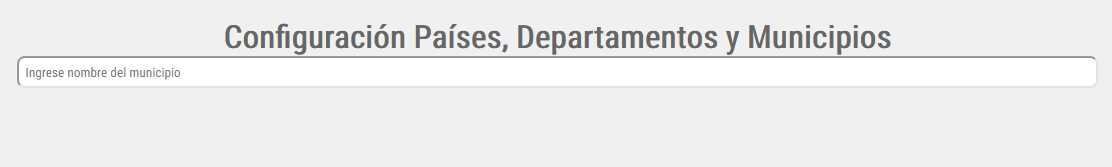 Al dar clic sobre la opción de “Configuración Países – Departamentos - Municipios” desde las opciones que se presentan en la figura 16 , el sistema despliega en la zona central un buscador para encontrar los municipios que se encuentran precargados en la base de datos, los cuales son el listado de departamentos y municipios que se encuentran en el listado oficial del DANE y permite agregar / actualizar cualquier municipio, población o corregimiento para facilitar los procesos relacionados con la mensajería para entrega por correspondencia física y ubicación geográfica de los remitentes / destinatarios.