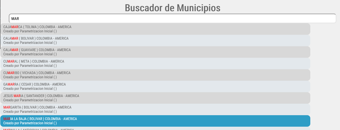 El nombre del municipio dentro del país y departamento seleccionados con el valor ingresado y las coincidencias resaltadas en color rojo.