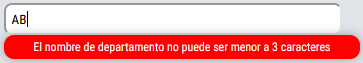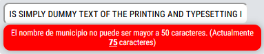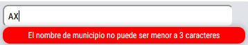Si se deja de cumplir alguna de estas condiciones el sistema muestra un error en color rojo el cual no permite grabar el municipio.