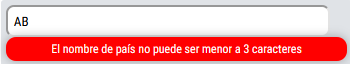 Si el tamaño del valor ingresado tiene entre 3 y 30 caracteres y existe en la base de datos uno o varios países que contengan los valores ingresados, el sistema despliega un listado con las 5 primeras coincidencias indicando: