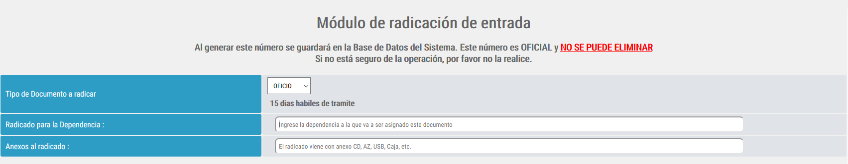Si se deja de cumplir alguna de estas condiciones el sistema muestra un error en color rojo y al intentar generar el radicado, simplemente no funcionará.