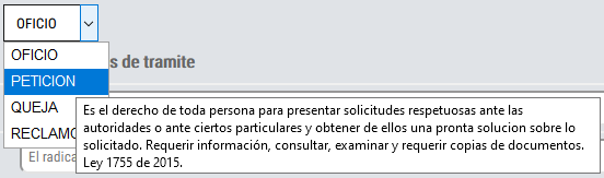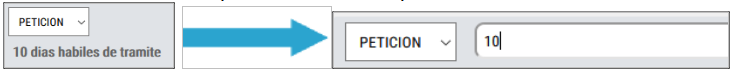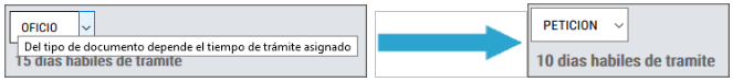 Por defecto viene seleccionado el valor ingresado en la Radicación Rápida con sus días hábiles de trámite correspondientes, pero al cambiar a algún otro valor del desplegable, el valor de días de trámite cambia de acuerdo al valor configurado por el administrador del sistema.