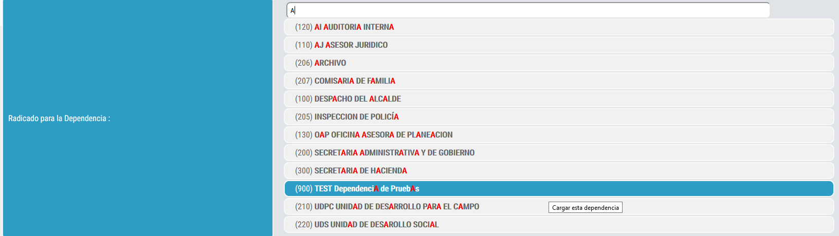 El segundo campo del formulario es Radicado para la Dependencia el cual es un buscador para encontrar las dependencias que se encuentran activas en la base de datos.