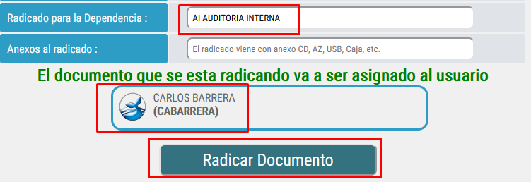 En caso que la secuencia exista correctamente, al seleccionar la opción se carga en el campo Radicado para la Dependencia el valor del nombre de la dependencia destino y en la parte de abajo muestra en letras verdes “El documento que se está radicando va a ser asignado al usuario” seguido de un cuadro con borde azul donde aparece la foto del usuario al que va a ser asignado el radicado, el nombre completo como aparece en la base de datos y entre paréntesis el login e inmediatamente despliega el botón de “Radicar Documento”.
