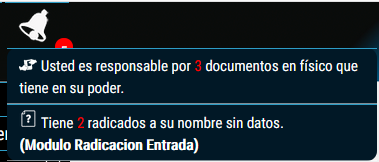 Después de que aparece la confirmación de creación del radicado, en la sección de alertas en la parte superior izquierda incrementa el contador en 2. Es decir, tiene pendiente 2 tareas con el radicado que se acaba de crear.