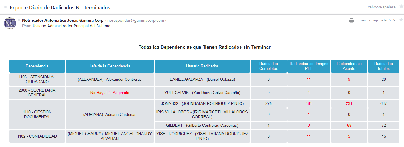 Estos contadores al final del día deben permanecer en cero ya que de eso depende que se cumpla correctamente cada uno de los procesos. Si estos contadores no están en cero, el sistema genera un reporte de pendientes al correo del usuario Jefe del área de manera diaria para garantizar que TODOS los documentos en físico se entregan a quien corresponda, que los datos del radicado hayan sido completados correctamente y que la imagen PDF del documento haya sido asignada de manera adecuada.
