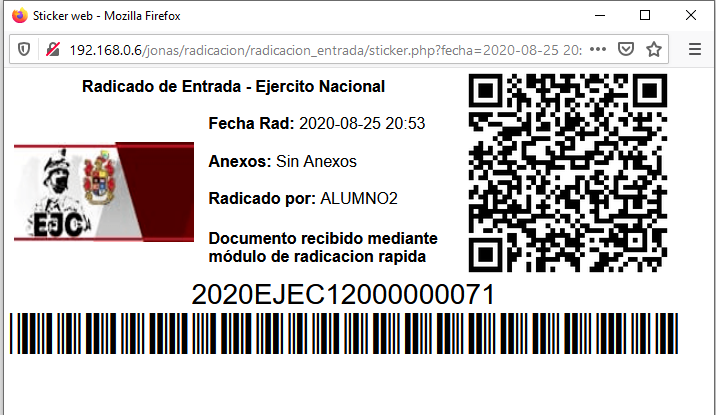 La primera opción que se muestra en la figura 52 es un hipervínculo subrayado con las letras en color azul con la palabra "Radicado" seguido del número de radicado asignado. Al hacer clic sobre esta opción, se genera una ventana emergente donde se visualiza el sticker web que se puede usar en impresoras de etiquetas, generando una o varias etiquetas autoadhesivas con el código de barras, código QR, logo de la entidad o empresa y la información básica del documento recibido para adherirlas al documento físico que se está recibiendo en un espacio en blanco donde no haya información en el original, en la copia que se le entrega al usuario que está radicando en la ventanilla y en los anexos al documento que no se digitalizan (Por ejemplo en los CD, Carpetas, AZ, Discos duros, etc.). Luego de imprimir el sticker se puede cerrar el sticker web haciendo clic en la "X"
