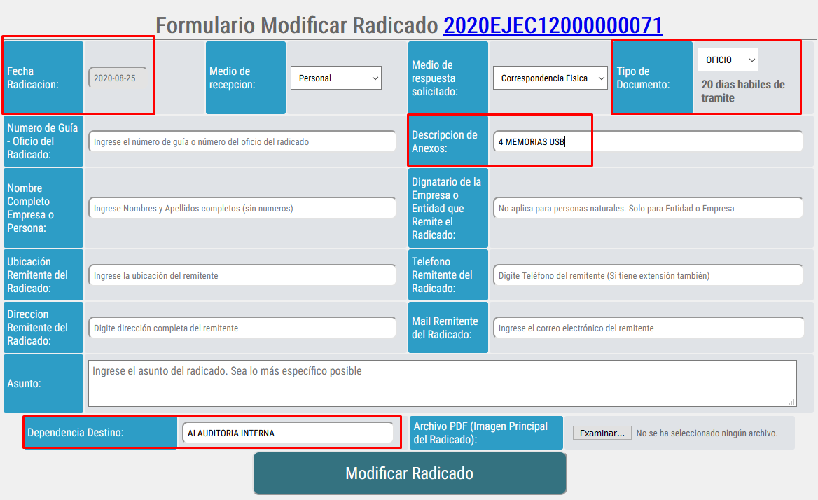 Si se deja de cumplir alguna de estas condiciones el sistema muestra un error en color rojo y al intentar modificar el radicado, simplemente no funcionará.