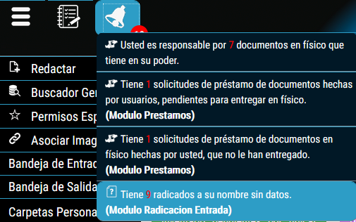 De la misma forma, en la parte superior izquierda se encuentra un icono de una campana junto con un contador del TOTAL de los pendientes de color rojo. Al dar clic sobre este icono, despliega en un listado, la misma información de los pendientes que tienen los cuadros de colores de la pantalla inicial, para que pueda visualizarla en cualquier momento.
