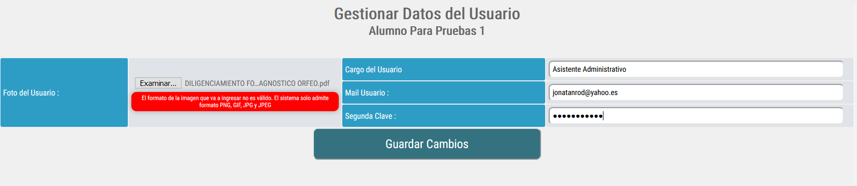 En este módulo se puede cambiar la fotografía que se muestra del usuario, se puede cargar una imagen en formato PNG, GIF, JPG y JPEG. Al cambiar el archivo, muestra una vista previa del archivo cargado. Si se carga un archivo con un formato diferente, el sistema despliega el error y al intentar guardar los cambios, el sistema simplemente no hará la modificación.