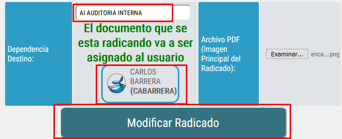 En caso que la secuencia exista correctamente, al seleccionar la opción se carga en el campo Radicado para la Dependencia el valor del nombre de la dependencia destino y en la parte de abajo muestra en letras verdes “El documento que se está radicando va a ser asignado al usuario” seguido de un cuadro con borde azul donde aparece la foto del usuario al que va a ser asignado el radicado, el nombre completo como aparece en la base de datos y entre paréntesis el login e inmediatamente despliega el botón de “Modificar Radicado”.